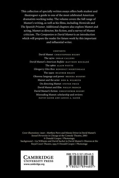 List of contributors Preface 1. David Mamet Christopher Bigsby 2. The 1970s Johan Callens 3. David Mamet's American Buffalo Matthew Roudané 4. The 1980s Alain Piette 5. Glengarry Glen Ross Benedict Nightingale 6. The 1990s Heather Braun 7. Oleanna: tragic power play Brenda Murphy 8. Mamet and the actor Don B. Wilmeth 9. On directing Mamet Steven Price 10. David Mamet and film Philip French 11. David Mamet's fiction Christopher Bigsby 12. Misreading Mamet: scholarship and reviews David Sauer and Janice A. Sauer Index.