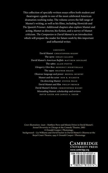 This collection of specially written essays offers both student and theatregoer a guide to one of the most celebrated American dramatists working today. Readers will find the general and accessible descriptions and analyses provide the perfect introduction to Mamet's work. The volume covers the full range of Mamet's writing, including now classic plays such as American Buffalo and Glengarry Glen Ross, and his more recent work, Boston Marriage, among others, as well as his films, such as The Verdict and Wag the Dog. Additional chapters also explore Mamet and acting, Mamet as director, his fiction, and a survey of Mamet criticism. The Companion to David Mamet is an introduction which will prepare the reader for future work by this important and influential writer.