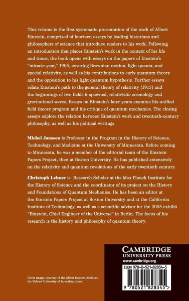 This volume is the first systematic presentation of the work of Albert Einstein, comprising fourteen essays by leading historians and philosophers of science that introduce readers to his work. Following an introduction that places Einstein's work in the context of his life and times, the book opens with essays on the papers of Einstein's 'miracle year', 1905, covering Brownian motion, light quanta, and special relativity, as well as his contributions to early quantum theory and the opposition to his light quantum hypothesis. Further essays relate Einstein's path to the general theory of relativity (1915) and the beginnings of two fields it spawned, relativistic cosmology and gravitational waves. Essays on Einstein's later years examine his unified field theory program and his critique of quantum mechanics. The closing essays explore the relation between Einstein's work and twentieth-century philosophy, as well as his political writings.