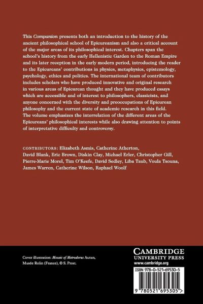 This Companion offers both an introduction to the history of the ancient philosophical school of Epicureanism and also a critical account of the major areas of its philosophical interest. An international team of contributors present and analyse the Epicureans' contributions in physics, metaphysics, epistemology, psychology, ethics, and politics.