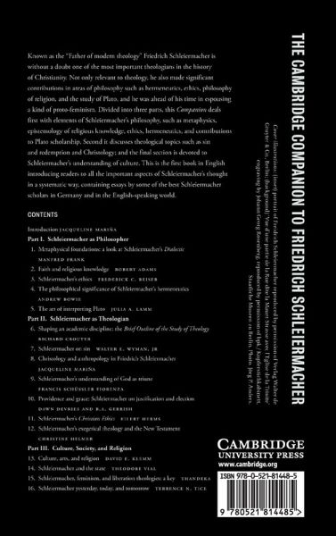 Introduction Jacqueline Mariña; Part I. Schleiermacher as Philosopher: 1. Metaphysical foundations: a look at Schleiermacher's 'Dialectic' Manfred Frank; 2. Faith and religious knowledge Robert Adams; 3. Schleiermacher's ethics Fred Beiser; 4. The philosophical significance of Schleiermacher's hermeneutics Andrew Bowie; 5. The art of interpreting Plato Julia Lamm; Part II. Schleiermacher as Theologian: 6. Shaping and academic discipline: the brief outline on the study of theology Richard Crouter; 7. Schleiermacher on sin Walter Wyman; 8. Christology and anthropology in Freidrich Schleiermacher Jacqueline Mariña; 9. Schleiermacher's understanding of God as triune Francis Fiorenza; 10. Providence and grace: Schleiermacher on justification and election Brian Gerrish and Dawn DeVries; 11. Schleiermacher's 'Christian Ethics' Eilert Herms; 12. Schleiermacher's exegetical theology and the New Testament Christine Helmer; Part III. Culture, Society and Religion: 13. Culture, arts and religion David Klemm; 14. Schleiermacher and the state Theodore Vial; 15. Schleiermacher, feminism and liberation theologies: a key Thandeka; 16. Schleiermacher yesterday, today and tomorrow Terrence N. Tice.