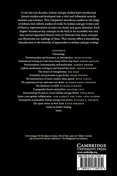 In the last two decades, lesbian and gay studies have transformed literary studies. The Cambridge Companion to Gay and Lesbian Writing introduces readers to important concepts, methods and cultural and historical debates relevant to the study of sexuality and literature.