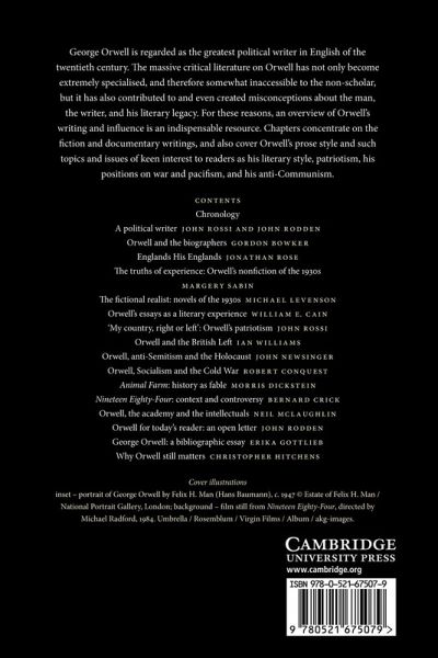 Preface; Notes on contributors; An Orwell calendar John Rodden; 1. A political writer John Rossi and John Rodden; 2. Orwell and the biographers Gordon Bowker; 3. Englands his Englands: Orwell's Britain between the wars Jonathan Rose; 4. The truths of experience: Orwell's nonfiction of the 1930s Margery Sabin; 5. The fictional realist: novels of the 1930s Michael Levenson; 6. Orwell's essays as a literary experience William Cain; 7. 'My Country, Right or Left': Orwell's patriotism John Rossi; 8. Orwell and the British left Ian Williams; 9. Orwell, anti-semitism, and the Holocaust John Newsinger; 10. Orwell and the Cold War Robert Conquest; 11. Animal Farm: history as fable M. Dickstein; 12. Nineteen Eighty-Four: context and controversy B. Crick; 13. Orwell, the academy, and the intellectuals Neil McLaughlin; 14. Orwell for today's reader: an open letter John Rodden; 15. George Orwell: a bibliographic essay Erika Gottlieb; 16. Why Orwell still matters Christopher Hitchens; Further reading.