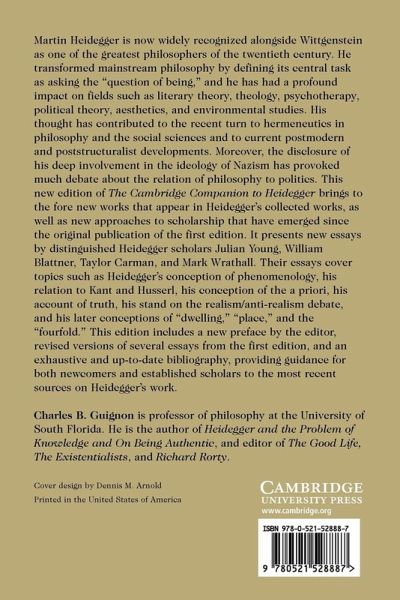 Martin Heidegger is now widely recognized as one of the greatest philosophers of the twentieth century. He transformed mainstream philosophy by defining its central task as asking the'question of being', and he has had a profound impact on fields such as literary theory, theology, psychotherapy, political theory, aesthetics, and environmental studies. This new edition of The Cambridge Companion to Heidegger brings to the fore new works that appear in Heidegger's collection, as well as new approaches to scholarship that have emerged since the publication of the first edition.