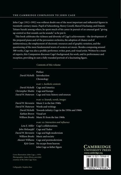 List of illustrations Notes on contributors Preface Acknowledgements Chronology Part I. Aesthetic Contexts: 1. Cage and America David Nicholls 2. Cage and Europe Christopher Shultis 3. Cage and Asia: history and sources David W. Patterson Part II. Sounds, Words, Images: 4. Music I: to the late 1940s David W. Bernstein 5. Words and writings David W. Patterson 6. Towards infinity: Cage in the 1950s and 1960s David Nicholls 7. Visual art Kathan Brown 8. Music II: from the late 1960s William Brooks Part III. Interaction and Influence: 9. Cage's collaborations Leta E. Miller 10. Cage and Tudor John Holzaepfel 11. Cage and high modernism David W. Bernstein 12. Music and society William Brooks 13. Cage and postmodernism Alastair Williams 14. No escape from heaven: John Cage as father figure Kyle Gann Endnotes Bibliography Index.