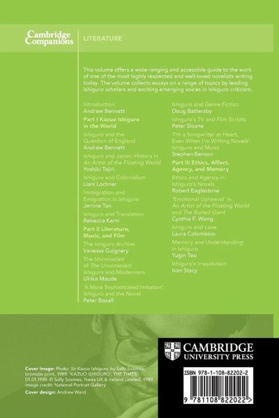 Part I. Kazuo Ishiguro in the World: 1. Ishiguro and the question of England Andrew Bennett 2. Ishiguro and Japan: History in An Artist of the Floating World Yoshiki Tajiri 3. Ishiguro and colonialism Liani Lochner 4. Immigration and emigration in Ishiguro Jerrine Tan 5. Ishiguro and translation Rebecca Karni Part II. Literature, Music, and Film: 6. The Ishiguro archive Vanessa Guignery 7. The unconsoled of The Unconsoled: Ishiguro and modernism Ulrika Maude 8. 'A more sophisticated imitation': Ishiguro and the novel Peter Boxall 9. Ishiguro and genre fiction Doug Battersby 10. Ishiguro's TV and film scripts Peter Sloane 11. 'I'm a songwriter at heart, even when I'm writing novels': Ishiguro and music Stephen Benson Part III. Ethics, Affect, Agency, and Memory: 12. Ethics and agency in Ishiguro's novels Robert Eaglestone 13. 'Emotional upheaval' in An Artist of the Floating World and The Buried Giant Cynthia F. Wong 14. Ishiguro and love Laura Colombino 15. Memory and understanding in Ishiguro Yugin Teo 16. Ishiguro's irresolution Ivan Stacy.