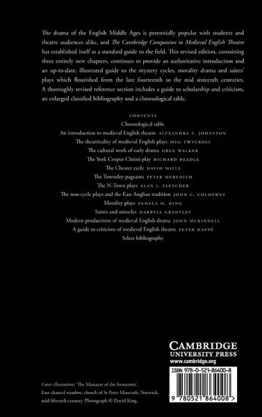 The drama of the English Middle Ages is perennially popular with students and theatre audiences alike, and this is an updated edition of a book which has established itself as a standard guide to the field. The Cambridge Companion to Medieval English Theatre, second edition continues to provide an authoritative introduction and an up-to-date, illustrated guide to the mystery cycles, morality drama and saints' plays which flourished from the late fourteenth to the mid-sixteenth centuries. The book emphasises regional diversity in the period and engages with the literary and particularly the theatrical values of the plays. Existing chapters have been revised and updated where necessary, and there are three entirely new chapters, including one on the cultural significance of early drama. A thoroughly revised reference section includes a guide to scholarship and criticism, an enlarged classified bibliography and a chronological table.