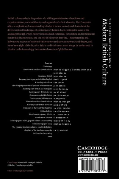 Chronology; Introduction: modern British culture Michael Higgins, Clarissa Smith and John Storey; 1. Becoming British John Storey; 2. Language developments in British English David Crystal; 3. Schooling and culture Ken Jones; 4. The changing character of political communication John Street; 5. Contemporary Britain and its regions John Tomaney; 6. Contemporary British cinema Sarah Street; 7. Contemporary British fiction Patricia Waugh; 8. Contemporary British poetry Alex Goody; 9. Theatre in modern British culture Michael Mangan; 10. Contemporary British television Jane Arthurs; 11. British art in the twenty-first century Valerie Reardon; 12. British fashion Caroline Evans; 13. Sport in contemporary Britain Ellis Cashmore; 14. British sexual cultures Clarissa Smith; 15. British popular music, popular culture and exclusivity Sheila Whiteley; 16. British newspapers today Michael Higgins; 17. The struggle for ethno-religious equality in Britain: the place of the Muslim community Tariq Madood; Guide to further reading; Index.