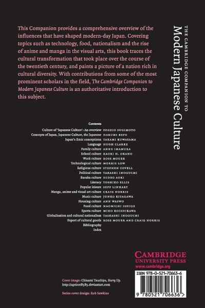 List of illustrations List of tables List of contributors Acknowledgements Chronology Map Culture of 'Japanese culture': an overview Yoshio Sugimoto 1. Concepts of Japan, Japanese culture, the Japanese Harumi Befu 2. Japan's emic conceptions Takami Kuwayama 3. Language Hugh Clarke 4. Family culture Anne Imamura 5. School culture Kaori H. Okano 6. Work culture Ross Mouer 7. Technological culture Morris Low 8. Religious culture Stephen Covell 9. Political culture Takashi Inoguchi 10. Buraku culture Hideo Aoki 11. Literature Toshiko Ellis 12. Popular leisure Sepp Linhart 13. Manga, anime and visual art culture Craig Norris 14. Music culture Junko Kitagawa 15. Housing culture Ann Waswo 16. Food culture Naomichi Ishige 17. Sports culture Miho Koishikawa 18. Globalisation and cultural nationalism Takashi Inoguchi 19. Export of cultural goods Ross Mouer and Craig Norris.
