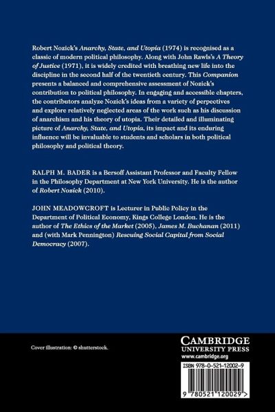 Robert Nozick's Anarchy, State, and Utopia (1974) is recognised as a classic of modern political philosophy. Along with John Rawls's A Theory of Justice (1971), it is widely credited with breathing new life into the discipline in the second half of the twentieth century. This Companion presents a balanced and comprehensive assessment of Nozick's contribution to political philosophy. In engaging and accessible chapters, the contributors analyse Nozick's ideas from a variety of perspectives and explore neglected areas of the work such as his discussion of anarchism and his theory of utopia. Their detailed and illuminating picture of Anarchy, State, and Utopia, its impact and its enduring influence will be invaluable to students and scholars in both political philosophy and political theory. This Companion presents a balanced and comprehensive assessment of Nozick's classic contribution to political philosophy. Contributors analyse Nozick's ideas from a variety of perspectives and assess the impact and enduring influence of his work. The volume will be invaluable to students and scholars in both political philosophy and political theory.