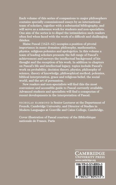 Each volume of this series of companions to major philosophers contains specially commissioned essays by an international team of scholars, together with a substantial bibliography, and will serve as a reference work for students and nonspecialists. One aim of the series is to dispel the intimidation such readers often feel when faced with the work of a difficult and challenging thinker. Blaise Pascal (1623-62) occupies a position of pivotal importance in many domains: philosophy, mathematics, physics, religious polemics and apologetics. In this volume a team of leading scholars presents the full range of Pascal's achievement and surveys the intellectual background of his thought and the reception of his work. New readers and nonspecialists will find this the most convenient and accessible guide to Pascal currently available. Advanced students and specialists will find a conspectus of recent developments in the interpretation of Pascal.