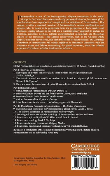 Pentecostalism is one of the fastest-growing religious movements in the world. Groups in the United States dominated early Pentecostal histories, but recent global manifestations have expanded and complicated the definition of Pentecostalism. This volume provides a nuanced overview of Pentecostalism's various manifestations and explores what it means to be Pentecostal from the perspectives of both insiders and outsiders. Leading scholars in the field use a multidisciplinary approach to analyze the historical, economic, political, anthropological, sociological and theological aspects of the movement. They address controversies, such as the Oneness-Trinity controversy; introduce new theories; and chart trajectories for future research. The Cambridge Companion to Pentecostalism will enable beginners to familiarize themselves with the important issues and debates surrounding the global movement, while also offering experienced scholars a valuable handbook for reference.
