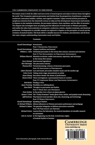 Percussion music is both the oldest and most recent of musical genres and exists in diverse forms throughout the world. This Companion explores percussion and rhythm from the perspectives of performers, composers, conductors, instrument builders, scholars, and cognitive scientists. Topics covered include percussion in symphony orchestras from the nineteenth century to today and the development of percussion instruments in chapters on the marimba revolution, the percussion industry, drum machines, and the effect of acoustics. Chapters also investigate drum set playing and the influences of world music on Western percussion, and outline the roles of percussionists as composers, conductors, soloists, chamber musicians, and theatrical performers. Developments in scientific research are explored in chapters on the perception of sound and the evolution of musical rhythm. This book will be a valuable resource for students, percussionists, and all those who want a deeper understanding of percussion music and rhythm.