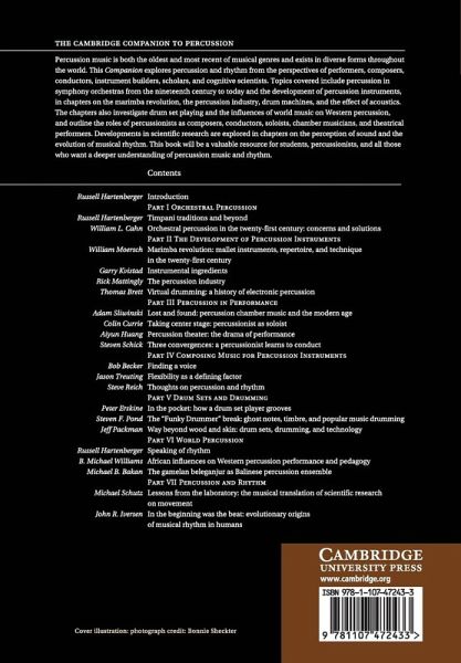 Percussion music is both the oldest and most recent of musical genres and exists in diverse forms throughout the world. This Companion explores percussion and rhythm from the perspectives of performers, composers, conductors, instrument builders, scholars, and cognitive scientists. Topics covered include percussion in symphony orchestras from the nineteenth century to today and the development of percussion instruments in chapters on the marimba revolution, the percussion industry, drum machines, and the effect of acoustics. Chapters also investigate drum set playing and the influences of world music on Western percussion, and outline the roles of percussionists as composers, conductors, soloists, chamber musicians, and theatrical performers. Developments in scientific research are explored in chapters on the perception of sound and the evolution of musical rhythm. This book will be a valuable resource for students, percussionists, and all those who want a deeper understanding of percussion music and rhythm.