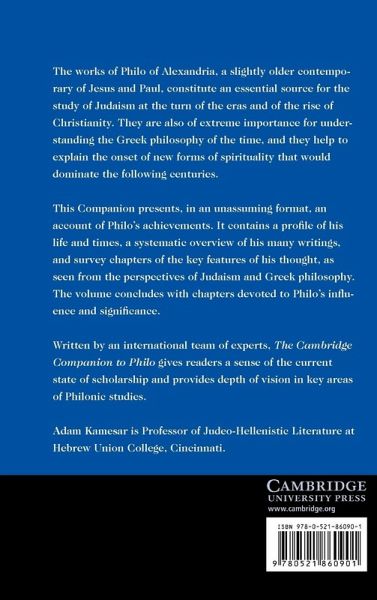 The works of Philo of Alexandria, a slightly older contemporary of Jesus and Paul, constitute an essential source for the study of Judaism and the rise of Christianity. They are also of extreme importance for understanding the Greek philosophy of the time and help to explain the onset of new forms of spirituality that would dominate the following centuries. This handbook presents an account of Philo's achievements. It contains a profile of his life and times, a systematic overview of his many writings, and survey chapters of the key features of his thought, as seen from the perspectives of Judaism and Greek philosophy. The volume concludes with a section devoted to Philo's influence and significance. Composed by an international team of experts, The Cambridge Companion to Philo gives readers a sense of the state of scholarship and provides depth of vision in key areas of Philonic studies.