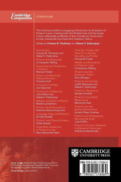Preface and acknowledgements Introduction 1. Plutarch and Biography Christophe Pellingr 2. Romanness and Greekness in Plutarch Manuel Tröster 3. Plutarch as moral educator Timothy Duff 4. In the spirit of Plato Jan Opsomer 5. Plutarch as a Polemicist John Dillon and Alexei Zadorojnyi 6. Religion and myth in Plutarch Robert Lamberton 7. Plutarch at the symposium Katerina Oikonomopoulou 8. Language, style, and Rhetoric Donald Russell 9. Plutarch and classical Greece Philip Stadter 10. Great men: leadership in Plutarch's lives Mark Beck 11. Thinking 'Private Life': Plutarch on gender, sexuality, family Françoise Frazier 12. Wealth and decadence in Plutarch's lives Christopher Pelling 13. Plutarch and the Barbarian 'Other' Eran Almagor 14. Plutarch and Animals Judith Mossman and Alexei Zadorojnyi 15. Plutarch in Byzantium Noreen Humble 16. Plutarch in the Italian Renaissance Marianne Pade 17. Plutarch and the Spanish Renaissance Aurelio Pérez Jiménez 18. Plutarch and Shakespeare: Reviving the dead Julia Griffin 19. Plutarch in France: sixteenth to eighteenth centuries Katherine MacDonald Bibliography.