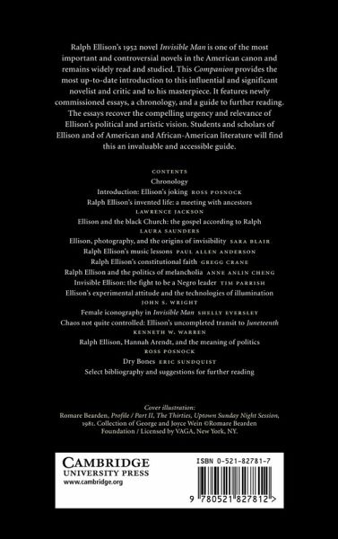 Ralph Ellison's classic 1952 novel Invisible Man is one of the most important and controversial novels in the American canon and remains widely read and studied. This Companion provides an introduction to this influential and significant novelist and critic and to his masterpiece. It features essays by leading scholars, a chronology and a guide to further reading. The essays reveal alternative dimensions of Ellison's art radiating out from Invisible Man into other domains - technology, political theory, law, photography, music, religion - and recover the compelling urgency and relevance of Ellison's political and artistic vision. Since Ellison's death his published oeuvre has been expanded by several major volumes - his collected essays, the fragment of a novel, Juneteenth (1999), letters and short stories - examined here in the context of his life and work. Students and scholars of Ellison and of American and African-American literature will find this an invaluable and accessible guide.