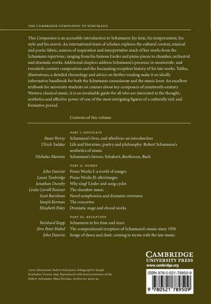Part I. Contexts: 1. Introduction to Schumann: life stories Beate Perrey; 2. Life and literature, poetry and philosophy: Robert Schumann's aesthetics of music Ulrich Tadday; 3. Schumann's heroes: Schubert, Beethoven, Bach Nicholas Marston; Part II. Works: 4. The piano music I: a world of images John Daverio; 5. The piano music II: afterimages Laura Tunbridge; 6. Why sing? Lieder and song cycles Jonathan Dunsby; 7. The chamber music Linda Roesner; 8. Novel symphonies and dramatic overtures Scott Burnham; 9. The concertos Joseph Kerman; 10. Dramatic stage and choral works Liz Paley; Part III. Reception: 11. Schumann in his time and since Reinhard Kapp; 12. The compositional reception of Schumann's music since 1950 Jörn Peter Hiekel; 13. Songs of dawn and dusk: coming to terms with the late music John Daverio.