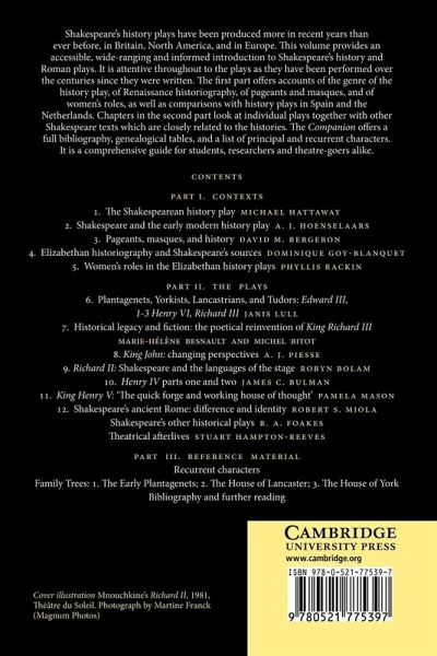 Part I. Contexts: 1. The Shakespearean history play Michael Hattaway; 2. Shakespeare and the early modern history play A. J. Hoenselaars; 3. Pageants, masques, and history David M. Bergeron; 4. Elizabethan historiography and Shakespeare's sources Dominique Goy-Blanquet; 5. Women's roles in the Elizabethan history plays Phyllis Rackin; Part II. The Plays: 6. Plantagenets, Yorkists, Lancastrians, and Tudors: Edward III, 1-3 Henry VI, Richard III Janis Lull; 7. Historical legacy and fiction: the poetical reinvention of King Richard III Marie-Hélène Besnault and Michel Bitot; 8. King John: changing perspectives A. J. Piesse; 9. Richard II: Shakespeare and the languages of the stage Robyn Bolam; 10. Henry IV Parts one and two James C. Bulman; 11. King Henry V: 'The quick forge and working house of thought' Pamela Mason; 12. Shakespeare's ancient Rome: difference and identity Robert S. Miola; 13. Shakespeare's other historical plays R. A. Foakes; 14. Theatrical afterlives Stuart Hampton-Reeves; Part III. Reference Material: Recurrent characters; Family Trees: 1. The Early Plantagenets; 2. The House of Lancaster; 3. The House of York; Bibliography and further reading.