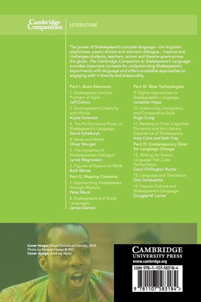 Part I. Basic Elements: 1. Shakespeare and the problem of style Jeff Dolven 2. Shakespeare's creativity with words Alysia Kolentsis 3. The performative power of Shakespeare's language David Schalkwyk 4. Verse and metre Oliver Morgan 5. The dynamics of Shakespearean dialogue Lynne Magnusson 6. Figures of speech at work Ruth Morse Part II. Shaping Contexts: 7. Approaching Shakespeare through rhetoric Peter Mack 8. Shakespeare and social languages James Siemon Part III. New Technologies: 9. Digital approaches to Shakespeare's language Jonathan Hope 10. Authorship, computers, and comparative style Hugh Craig 11. Reading in time: cognitive dynamics and the literary experience of Shakespeare Amy Cook and Seth Frey Part IV. Contemporary Sites for Language Change: 12. Writing for actors: language that cues performance Carol Chillington Rutter 13. Language and translation Dirk Delabastita 14. Popular culture and Shakespeare's language Douglas M. Lanier.
