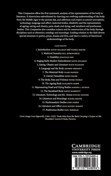 This Companion offers the first systematic analysis of the representation of the body in literature. It historicizes embodiment by charting our evolving understanding of the body from the Middle Ages to the present day, and addresses such questions as sensory perception, technology, language and affect; maternal bodies, disability and the representation of ageing; eating and obesity, pain, death and dying; and racialized and posthuman bodies. This Companion also considers science and its construction of the body through disciplines such as obstetrics, sexology and neurology. Leading scholars in the field devote special attention to poetry, prose, drama and film, and chart a variety of theoretical understandings of the body.