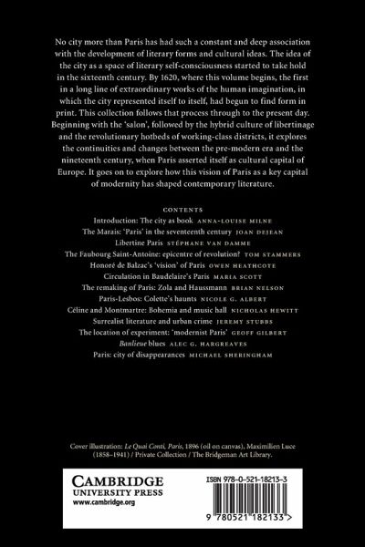 No city more than Paris has had such a constant and deep association with the development of literary forms and cultural ideas. The idea of the city as a space of literary self-consciousness started to take hold in the sixteenth century. By 1620, where this volume begins, the first in a long line of extraordinary works of the human imagination, in which the city represented itself to itself, had begun to find form in print. This collection follows that process through to the present day. Beginning with the 'salon', followed by the hybrid culture of libertinage and the revolutionary hotbeds of working-class districts, it explores the continuities and changes between the pre-modern era and the nineteenth century, when Paris asserted itself as cultural capital of Europe. It goes on to explore how this vision of Paris as a key capital of modernity has shaped contemporary literature.
