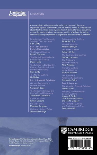 Introduction: The romantic sublime, then and now Cian Duffy Part I. The Sublime Before Romanticism: 1. The classical sublime Patrick Glauthier 2. The natural sublime in the seventeenth century Dawn Hollis 3. The sublime in eighteenth-century English, Irish and Scottish philosophy Cian Duffy 4. The Nordic sublime Lis Møller Part II. Romantic Sublimes: 5. German romanticism and the sublime Christoph Bode 6. The romantic sublime and Kant's critical philosophy Timothy M. Costelloe 7. Alpine sublimes Patrick Vincent 8. Urban sublimes Matthew Sangster 9. Highlands, lakes, wales Simon Bainbridge 10. Science and the sublime Richard C. Sha 11. Musical sublimes Miranda Stanyon 12. The arctic sublime Robert W. Rix 13. The body and the sublime Norbert Lennartz 14. The sublime in romantic painting Nina Amstutz 15. From the sublime to the ridiculous Andrew McInnes 16. The sublime in American romanticism Cassandra Falke Part III. Legacies: 17. The Victorian chthonic sublime Tatjana Juki¿ 18. Mapping the nineteenth-century sublime Joanna E. Taylor, Christopher Donaldson and Ian N. Gregory 19. The romantic sublime and environmental Crisis Tess Somervell.