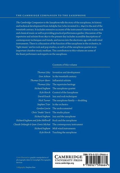 1. Invention and development Thomas Liley 2. In the twentieth century Don Ashton 3. Influential soloists Thomas Dryer-Beers 4. The repertoire heritage Thomas Liley 5. The saxophone quartet Richard Ingham 6. The mechanics of playing the saxophone: i. Saxophone technique Kyle Horch ii. Jazz and rock techniques David Roach iii. The saxophone family: playing characteristics and doubling Nick Turner 7. The professional player: i. In the orchestra Stephen Trier ii. The undocumented Gordon Lewin iii. The studio player Chris 'Snake' Davis 8. Jazz and the saxophone Richard Ingham 9. Rock and the saxophone Richard Ingham and John Helliwell 10. The saxophone today: i. The contemporary saxophone Claude Delangle and Jean-Denis Michat ii. Midi wind instruments Richard Ingham 11. Teaching the saxophone Kyle Horch.