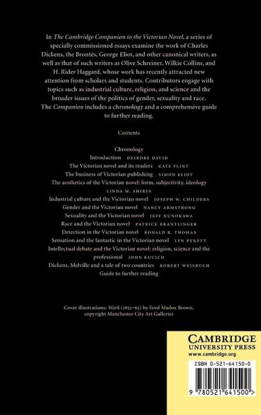 Introduction Deirdre David; 1. The Victorian novel and its readers Kate Flint; 2. The business of Victorian publishing Simon Eliot; 3. The aesthetics of the Victorian novel: form, subjectivity, ideology Linda M. Shires; 4. Industrial culture and the Victorian novel Joseph W. Childers; 5. Gender and the Victorian novel Nancy Armstrong; 6. Sexuality and the Victorian novel Jeff Nunokawa; 7. Race and the Victorian novel Patrick Brantlinger; 8. Detection in the Victorian novel Ronald R. Thomas; 9. Sensation and the fantastic in the Victorian novel Lyn Pykett; 10. Intellectual debate and the Victorian novel: religion, science and the professional John Kucich; 11. Dickens, Melville and a tale of two countries Robert Weisbuch; Guide to further reading.