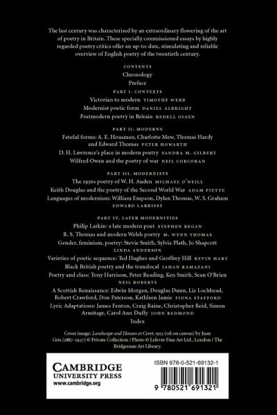Chronology; Preface; Part I. Contexts: 1. Victorian to modern Timothy Webb; 2. Modernist poetic form Daniel Albright; 3. Postmodern poetry in Britain Redell Olsen; Part II. Moderns: 4. Fateful forms: A. E. Housman, Charlotte Mew, Thomas Hardy and Edward Thomas Peter Howarth; 5. D. H. Lawrence's place in modern poetry Sandra Gilbert; 6. Wilfred Owen and the poetry of war Neil Corcoran; Part III. Modernists: 7. The 1930s poetry of W. H. Auden Michael O'Neill; 8. Keith Douglas and the poetry of the Second World War Adam Piette; 9. Languages of modernism: William Empson, Dylan Thomas, W. S. Graham Edward Larrissy; Part IV. Later Modernities: 10. Philip Larkin: a late modern poet Stephen Regan; 11. R. S. Thomas and modern Welsh poetry M. Wynn Thomas; 12. Gender, feminism, poetry: Stevie Smith, Sylvia Plath, Jo Shapcott Linda Anderson; 13. Varieties of poetic sequence: Ted Hughes and Geoffrey Hill Kevin Hart; 14. Black British poetry and the translocal Jahan Ramazani; 15. Poetry and class: Tony Harrison, Peter Reading, Ken Smith, Sean O'Brien Neil Roberts; 16. A Scottish Renaissance: Edwin Morgan, Douglas Dunn, Liz Lochhead, Robert Crawford, Don Paterson, Kathleen Jamie Fiona Stafford; 17. Lyric adaptations: James Fenton, Craig Raine, Christopher Reid, Simon Armitage, Carol Ann Duffy John Redmond.