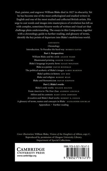 Poet, painter, and engraver William Blake died in 1827 in obscure poverty with few admirers. The attention paid today to his remarkable poems, prints, and paintings would have astonished his contemporaries. Admired for his defiant, uncompromising creativity, he has become one of the most anthologized and studied writers in English and one of the most studied and collected British artists. His urge to cast words and images into masterpieces of revelation has left us with complex, forceful, extravagant, some times bizarre works of written and visual art that rank among the greatest challenges to plain understanding ever created. This Companion aims to provide guidance to Blake's work in fresh and readable introductions: biographical, literary, art historical, political, religious, and bibliographical. Together with a chronology, guides to further reading, and glossary of terms, they identify the key points of departure into Blake's multifarious world and work.