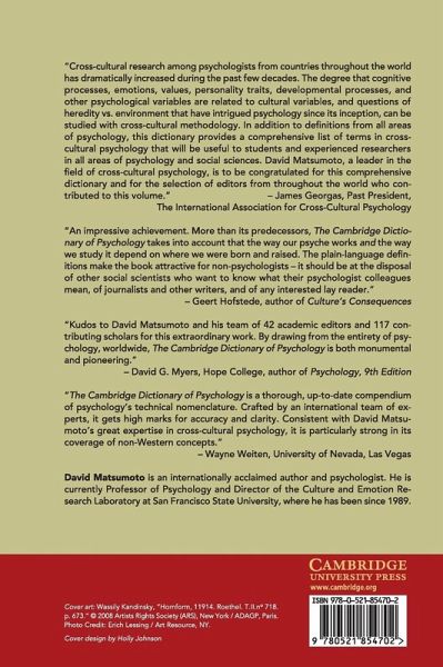 The Cambridge Dictionary of Psychology is the first and only dictionary that surveys the broad discipline of psychology from an international, cross-cultural, and interdisciplinary focus. This focus was achieved in several ways. The managing and consulting editorial boards were comprised of world-renowned scholars in psychology from many different countries, not just the United States. They reviewed and edited all of the keyword entries to make them lively and applicable across cultural contexts, incorporating the latest knowledge in contemporary international psychology. Thus entries related to culture, as well as those from all domains of psychology, are written with the broadest possible audience in mind. Also, many keywords central to contemporary psychology were incorporated that are not included in many competitors, including the Oxford and APA dictionaries.