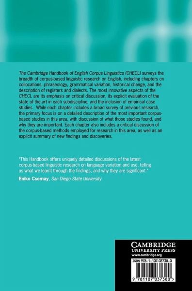 The Cambridge Handbook of English Corpus Linguistics (CHECL) surveys the breadth of corpus-based linguistic research on English, including chapters on collocations, phraseology, grammatical variation, historical change, and the description of registers and dialects. The most innovative aspects of the CHECL are its emphasis on critical discussion, its explicit evaluation of the state of the art in each sub-discipline, and the inclusion of empirical case studies. While each chapter includes a broad survey of previous research, the primary focus is on a detailed description of the most important corpus-based studies in this area, with discussion of what those studies found, and why they are important. Each chapter also includes a critical discussion of the corpus-based methods employed for research in this area, as well as an explicit summary of new findings and discoveries.