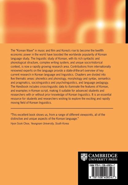 With contributions from global experts in Korean, this handbook gives a state-of-the-art overview of key trends in Korean linguistics, ranging from phonetics, phonology, morphology, syntax, semantics and pragmatics to sociolinguistics, psycholinguistics and language pedagogy. Researchers and students will find the Handbook an invaluable resource.