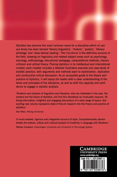 Stylistics has become the most common name for a discipline which at various times has been termed 'literary linguistics', 'rhetoric', 'poetics', 'literary philology' and 'close textual reading'. This Handbook is the definitive account of the field, drawing on linguistics and related subject areas such as psychology, sociology, anthropology, educational pedagogy, computational methods, literary criticism and critical theory. Placing stylistics in its intellectual and international context, each chapter includes a detailed illustrative example and case study of stylistic practice, with…mehr