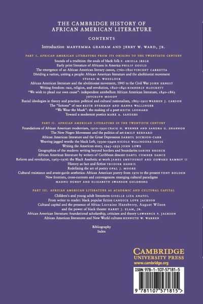 The first major twenty-first century history of four hundred years of black writing, The Cambridge History of African American Literature presents a comprehensive overview of the literary traditions, oral and print, of African-descended peoples in the United States. Expert contributors, drawn from the United States and beyond, emphasise the dual nature of each text discussed as a work of art created by an individual and as a response to unfolding events in American cultural, political, and social history. Unprecedented in scope, sophistication and accessibility, the volume draws together current scholarship in the field. It also looks ahead to suggest new approaches, new areas of study, and as yet undervalued writers and works. The Cambridge History of African American Literature is a major achievement both as a work of reference and as a compelling narrative and will remain essential reading for scholars and students in years to come.