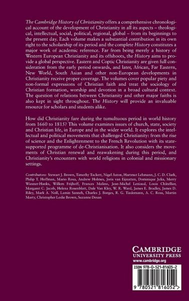 Introduction Stewart J. Brown and Timothy Tackett Part I. Church, State and Society in the European World, 1660-1780: 1. Continental Catholic Europe Nigel Aston 2. Continental Protestant Europe Hartmut Lehmann 3. Great Britain and Ireland J. C. D. Clark 4. The Church in economy and society Philip Hoffman Part II. Christian Life in the European World, 1660-1780: 5. The Catholic clergy in Europe Mario Rosa 6. The Protestant clergies in the European world Andrew Holmes 7. Reaching audiences: sermons and oratory in Europe Joris van Eijnatten 8. Christian education Dominique Julia 9. Christianity and gender Merry Wiesner-Hanks 10. Popular religion Willem Frijhoff 11. Jewish-Christian relations Frances Malino 12. Architecture and Christianity Jean-Michel Leniaud Part III. Movements and Challenges: 13. Christianity and the rise of sciences 1660-1815 Louis Châtellier 14. The Enlightenment critique of Christianity Margaret C. Jacob 15. The Christian Enlightenment Helena Rosenblatt 16. Jansenism and the international supression of the Jesuits Dale Van Kley 17. Evangelical awakenings in the North Atlantic world W. R. Ward 18. Toleration and movements of Christian reunion: 1660-1789 James E. Bradley Part IV. Christian Developments in the Non-European World: 19. Christianity in Iberian America James D. Riley 20. British and French North America through 1765 Mark A. Noll 21. Christianity in Africa Lamin Sanneh 22. Christianity in South and Southeast Asia Charles J. Borges 23. Christianity in East Asia R. G. Tiedemann 24. Christian encounters with other world religions A. C. Ross Part V. Revolution and the Christian World: 25. The American Revolution and religion: 1765-1815 Martin Marty 26. Christianity and the campaign against slavery and the slave trade Christopher Brown 27. The French Revolution and religion: through 1794 Timothy Tackett 28. The French Revolution and religion: 1795-1815 Suzanne Desan 29. Movements of Christian awakenings in revolutionary Europe, 1790-1815 Stewart J. Brown.