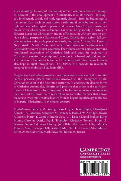 The first of the nine volume Cambridge History of Christianity series, Origins to Constantine provides a comprehensive overview of the essential events, persons, places and issues involved in the emergence of the Christian religion in the Mediterranean world in the first three centuries. Over thirty essays written by scholarly experts trace this dynamic history from the time of Jesus through to the rise of Imperial Christianity in the fourth century. It provides thoughtful and well-documented analyses of the diverse forms of Christian community, identity and practice that arose within decades of Jesus's death, and which through missionary efforts were soon implanted throughout the Roman Empire. Origins to Constantine examines the distinctive characteristics of Christian groups in each geographical region up to the end of the third century, while also exploring the development of the institutional forms, intellectual practices and theological formulations that would mark Christian history in subsequent centuries.