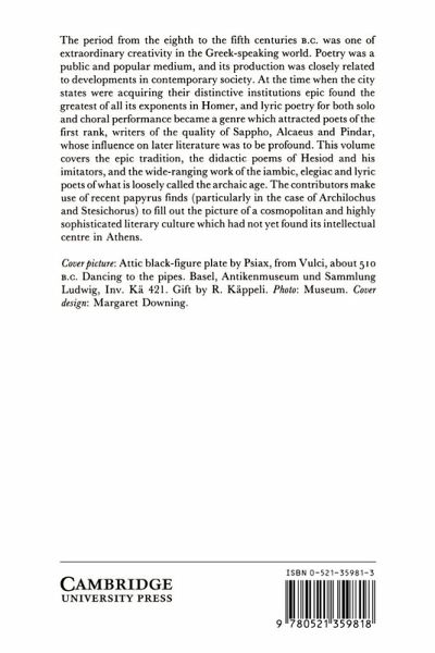 The period from the eight to the fifth centuries B.C. was one of extraordinary creativity in the Greek-speaking world. Poetry was apublic and popular medium, and its production was closely related to developments in contemporary society. At the time when the city states were acquiring their distinctive institutions epic found the greatest of all its exponents in Homer, and lyric poetry for both solo and choral performance became a genre which attracted poets of the first rank, writers of the quality of Sappho, Alcaeus and Pindar, whose influence on later literature was to be profound. This volume covers the epic tradition, the didactic poems of Hesiod and his imitators, and the wide-ranging work of the iambic, elegiac and lyric poets of what is loosely called the archaic age.