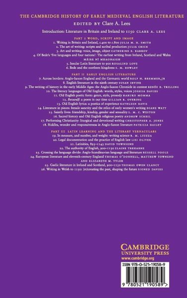 Introduction: literature in Britain and Ireland, 500-1150 Clare A. Lees; Part I. Word, Script and Image: 1. Writing in Britain and Ireland, 400-800 Julia M. H. Smith; 2. The art of writing: scripts and scribal production Julia Crick; 3. Art and writing: voice, image, object Catherine E. Karkov; 4. Of Bede's 'Five Languages and Four Nations': the earliest writing from Ireland, Scotland and Wales Máire Ní Mhaonaigh; 5. Insular Latin literature to 900 Rosalind Love; 6. Bede and the northern kingdoms S. M. Rowley; Part II. Early English Literature: 7. Across borders: Anglo-Saxon England and the Germanic world Rolf H. Bremmer, Jr; 8. English literature in the ninth century Susan Irvine; 9. The writing of history in the early Middle Ages: the Anglo-Saxon chronicle in context Renée R. Trilling; 10. The literary languages of Old English: words, styles, voices Joshua Davies; 11. Old English poetic form: genre, style, prosody Haruko Momma; 12. Beowulf: a poem in our time Gillian R. Overing; 13. Old English lyrics: a poetics of experience Kathleen Davis; 14. Literature in pieces: female sanctity and the relics of early women's writing Diane Watt; 15. Saintly lives: friendship, kinship, gender and sexuality L. M. C. Weston; 16. Sacred history and Old English religious poetry Andrew Scheil; 17. Performing Christianity: liturgical and devotional writing Christopher A. Jones; 18. Riddles, wonder and responsiveness in Anglo-Saxon literature Patricia Dailey; Part III. Latin Learning and the Literary Vernaculars: 19. In measure, and number, and weight: writing science R. M. Liuzza; 20. Legal documentation and the practice of English law Lisi Oliver; 21. Latinities, 893-1143 David Townsend; 22. The authority of English, 900-1150 Elaine Treharne; 23. Crossing the language divide: Anglo-Scandinavian language and literature Russell Poole; 24. European literature and eleventh-century England Thomas O' Donnell, Matthew Townend and Elizabeth M. Tyler; 25. Gaelic literature in Ireland and Scotland, 900-1150 Thomas Clancy; 26. Writing in Welsh to 1150: re-creating the past, shaping the future Sioned Davies.
