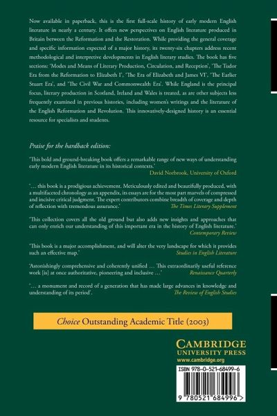 This 2003 book is a full-scale history of early modern English literature, offering perspectives on English literature produced in Britain between the Reformation and the Restoration. While providing the general coverage and specific information expected of a major history, its twenty-six chapters address recent methodological and interpretive developments in English literary studies. The book has five sections: 'Modes and Means of Literary Production, Circulation, and Reception', 'The Tudor Era from the Reformation to Elizabeth I', 'The Era of Elizabeth and James VI', 'The Earlier Stuart…mehr
