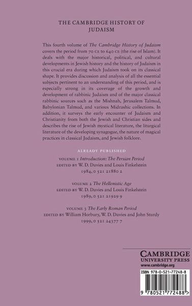 The fourth volume of The Cambridge History of Judaism covers the period from 70 CE to 640 CE (the rise of Islam), addressing the major historical, political and cultural developments in Jewish history during this crucial era. The volume is especially strong in its coverage of the growth and development of rabbinic Judaism and the major classical rabbinic sources such as the Mishnah, Jerusalem Talmud, Babylonian Talmud and various Midrashic collections. In addition, it surveys the growth of early Jewish mystical literature and the liturgical literature of the developing synagogue.