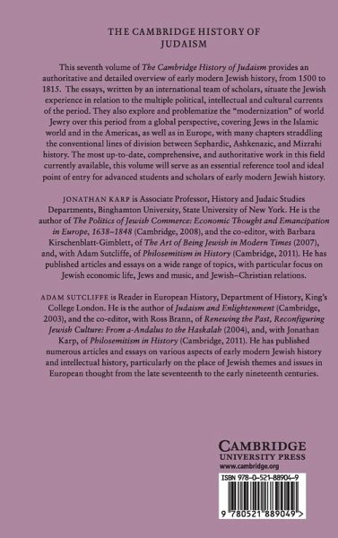 This seventh volume of The Cambridge History of Judaism provides an authoritative and detailed overview of early modern Jewish history, from 1500 to 1815. The essays, written by an international team of scholars, situate the Jewish experience in relation to the multiple political, intellectual and cultural currents of the period. They also explore and problematize the 'modernization' of world Jewry over this period from a global perspective, covering Jews in the Islamic world and in the Americas, as well as in Europe, with many chapters straddling the conventional lines of division between Sephardic, Ashkenazic, and Mizrahi history. The most up-to-date, comprehensive, and authoritative work in this field currently available, this volume will serve as an essential reference tool and ideal point of entry for advanced students and scholars of early modern Jewish history.