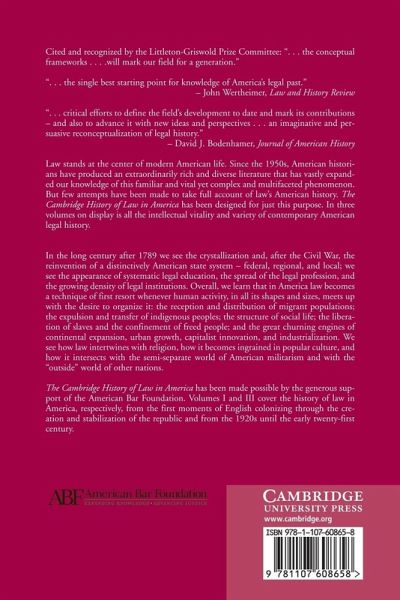 Volume 2 of The Cambridge History of Law in America focuses on the long nineteenth century (1789-1920). It deals with the formation and development of the American state system, the establishment and growth of systematic legal education, the spread of the legal profession, the growing density of legal institutions and their interaction with political and social action and the development of the modern criminal justice system. We also see how law intertwines with religion, how it becomes ingrained in popular culture and how it intersects with the worlds of the American military and of…mehr
