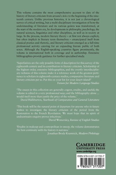 This is a comprehensive 1997 account of the history of literary criticism in Britain and Europe between 1660 and 1800. Unlike previous histories, it is not just a chronological survey of critical writing, but a multidisciplinary investigation of how the understanding of literature and its various genres was transformed, at the start of the modern era, by developments in philosophy, psychology, the natural sciences, linguistics, and other disciplines, as well as in society at large. In the process, modern literary theory - at first often implicit in literary texts themselves - emancipated itself from classical poetics and rhetoric, and literary criticism emerged as a full-time professional activity catering for an expanding literate public. The volume is international both in coverage and in authorship. Extensive bibliographies provide guidance for further specialised study.
