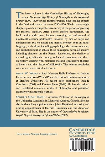This volume in the Cambridge Histories of Philosophy series brings together twenty-nine leading experts in the field and covers the years 1790â 1870. Their twenty-eight chapters provide a comprehensive survey of the period, organizing the material topically, and are framed by an editor's introduction and a bibliography.