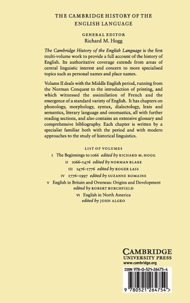 Volume 2 covers the Middle English Period, approximately 1066 1476, and describes and analyses developments in the language from the Norman Conquest to the introduction of printing.