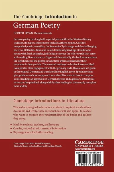 This Introduction is designed for students of German poetry and their teachers. Covering both familiar poems and new examples, it presents an up-to-date panorama of what the German poetic tradition has to offer. Focusing on key issues, it helps readers understand the poetic texts in their cultural contexts.