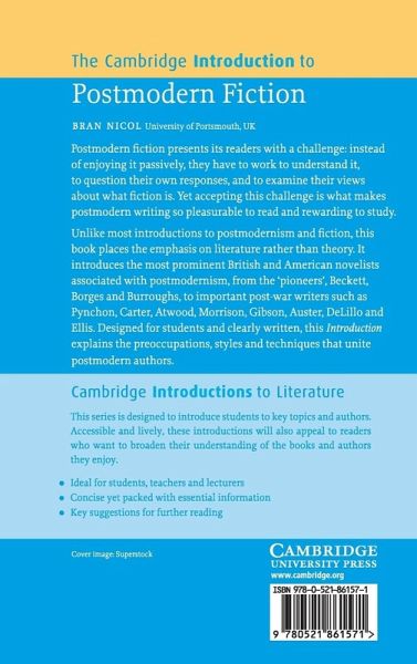 Preface: reading postmodern fiction 1. Postmodern fiction: theory and practice 2. Early postmodern fiction: Beckett, Borges, and Burroughs 3. 1960s and 1970s US metafiction: Coover, Barth, Nabokov, Vonnegut, Pynchon 4. The postmodern historical novel: Fowles, Barnes, Swift 5. Postmodern-postcolonial fiction 6. Postmodern fiction by women: Carter, Atwood, Acker 7. Two postmodern genres: cyberpunk and 'metaphysical' detective fiction 8. Fiction of the 'postmodern condition': Ballard, DeLillo, Ellis Bibliography Index.