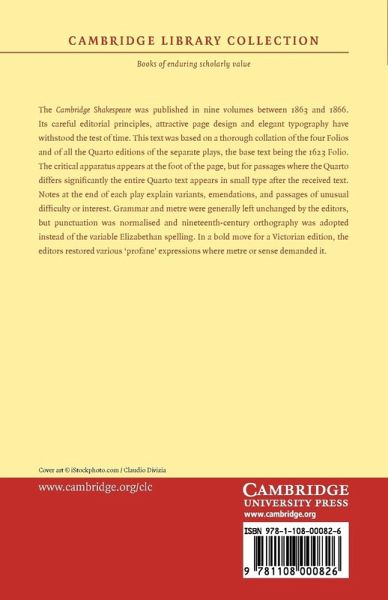The Cambridge Shakespeare was published in nine volumes between 1863 and 1866. Its careful editorial principles, attractive page design and elegant typography have withstood the test of time. This text was based on a thorough collation of the four Folios and of all the Quarto editions of the separate plays, the base text being the 1623 Folio. The critical apparatus appears at the foot of the page, but for passages where the Quarto differs significantly the entire Quarto text appears in small type after the received text. Notes at the end of each play explain variants, emendations, and passages of unusual difficulty or interest. Grammar and metre were generally left unchanged by the editors, but punctuation was normalised and nineteenth-century orthography was adopted instead of the variable Elizabethan spelling. In a bold move for a Victorian edition, the editors restored various 'profane' expressions where metre or sense demanded it.